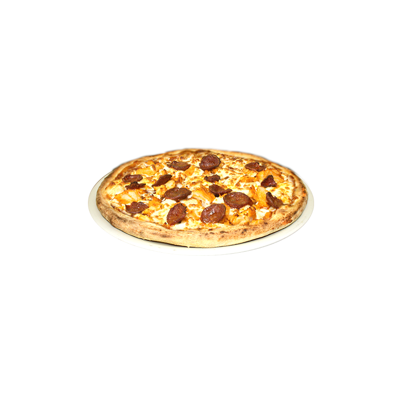 Base sauce barbecue, mozzarella, poulet rôti, chorizo, oignons